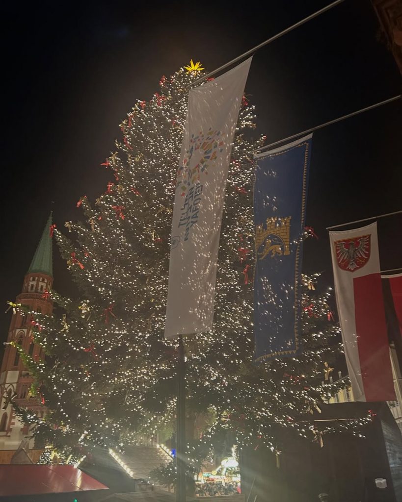 Von außen strahlt der große Weihnachtsbaum auf dem Frankfurter Weihnachtsmarkt und lässt die Stadt in festlichem Licht erleuchten.